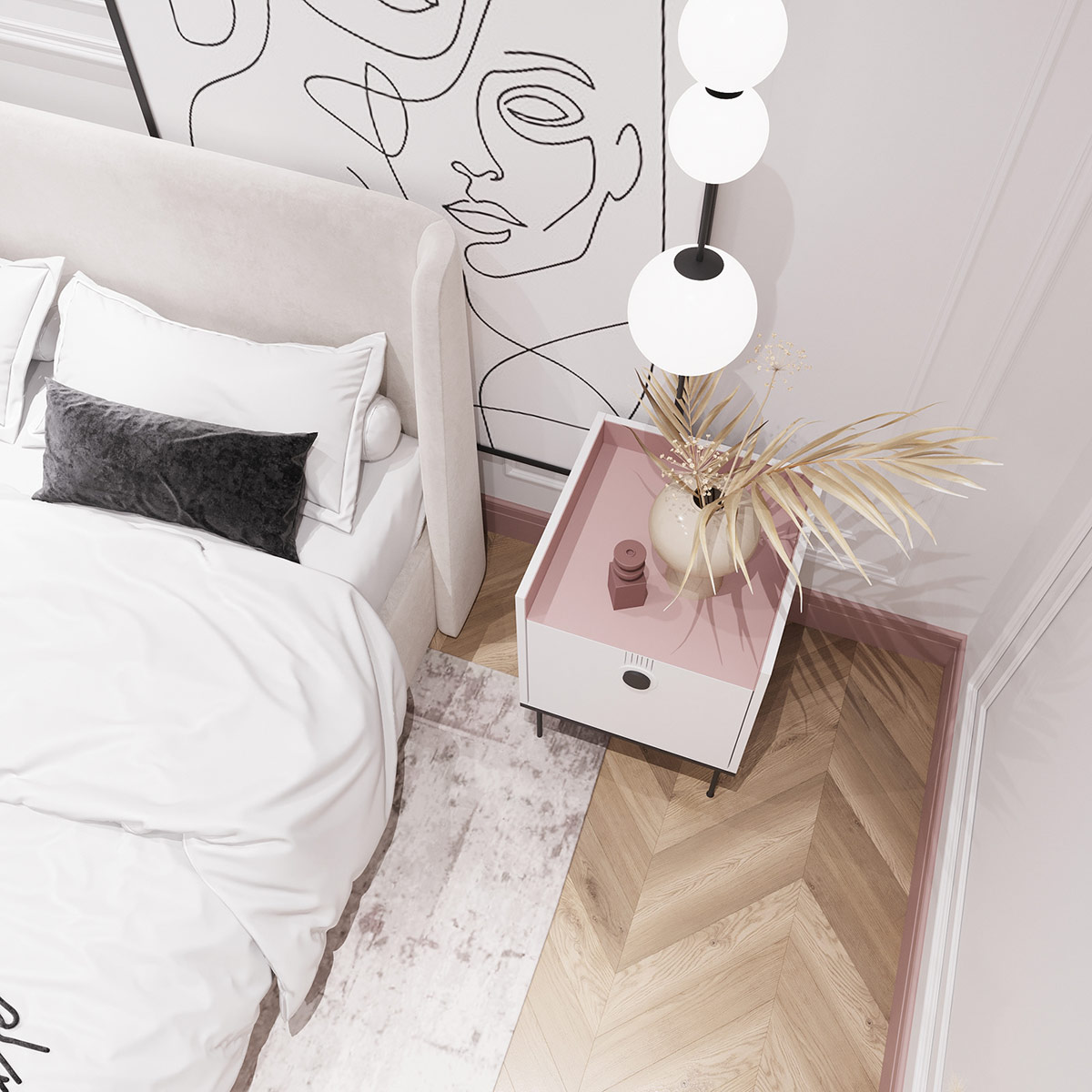 明亮的吊燈落在粉紅色的床頭柜上。