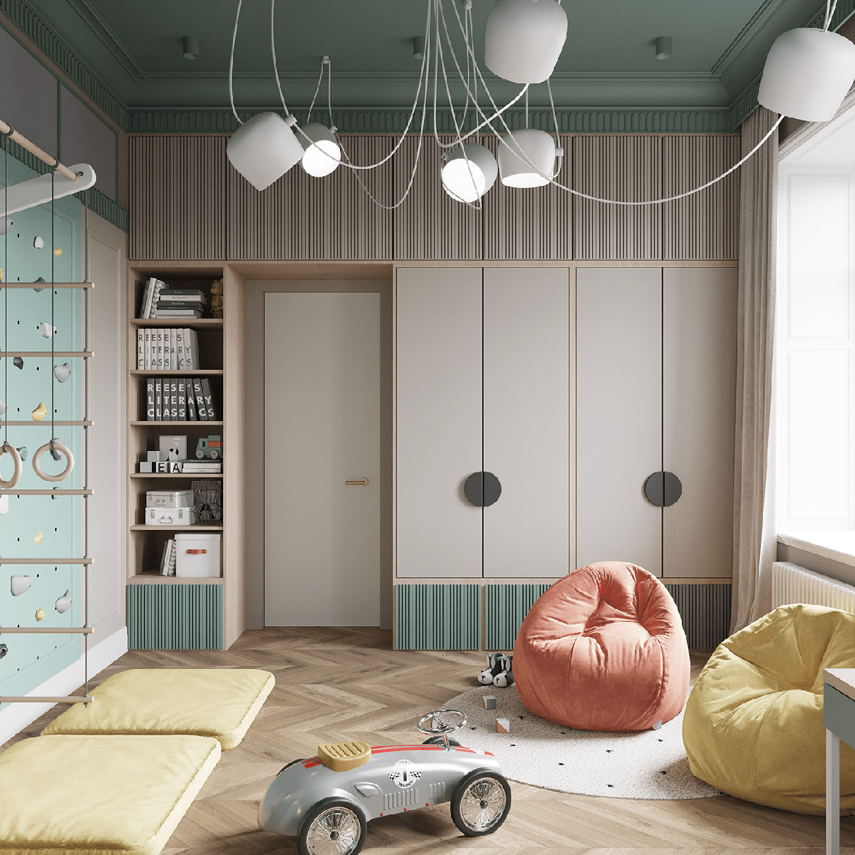 在天窗的對面是一個充滿冒險精神的現代兒童房設計。一個AIM吊燈串滿眼的綠色頂棚俏皮的糾結。