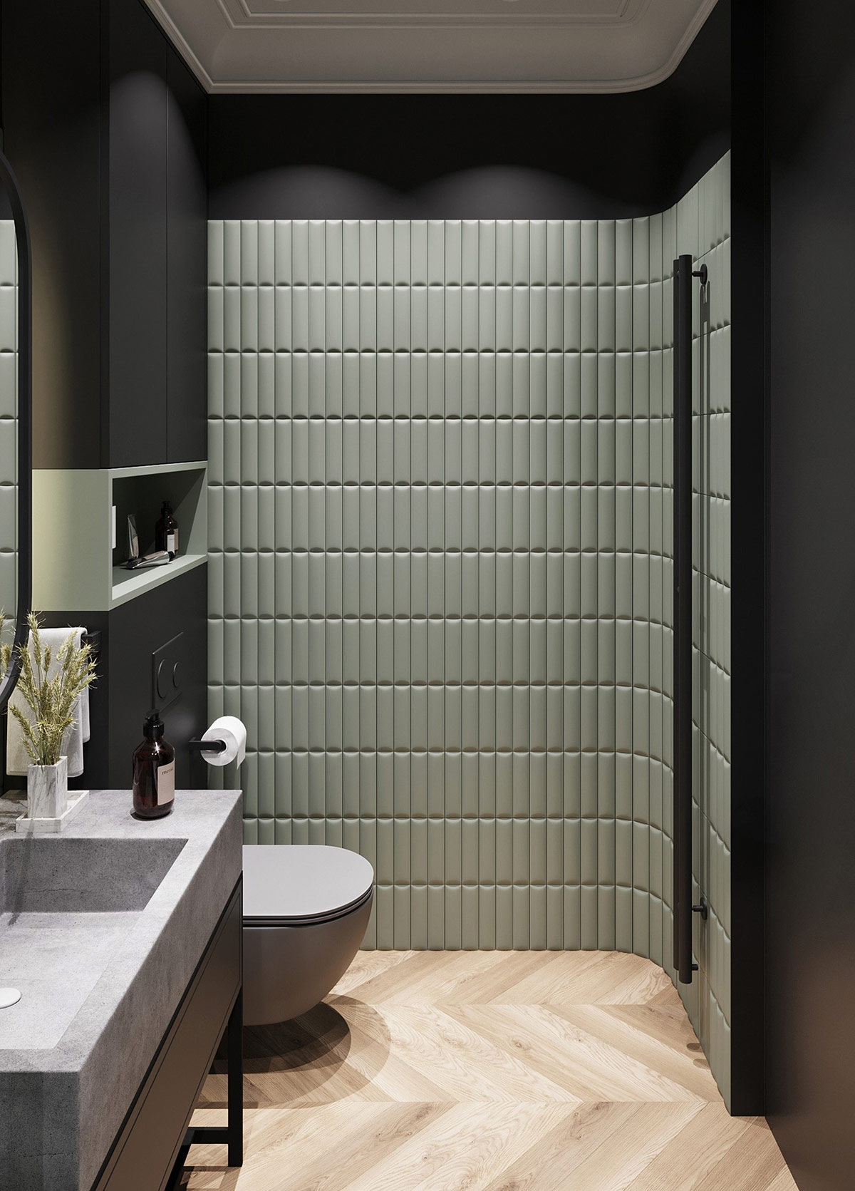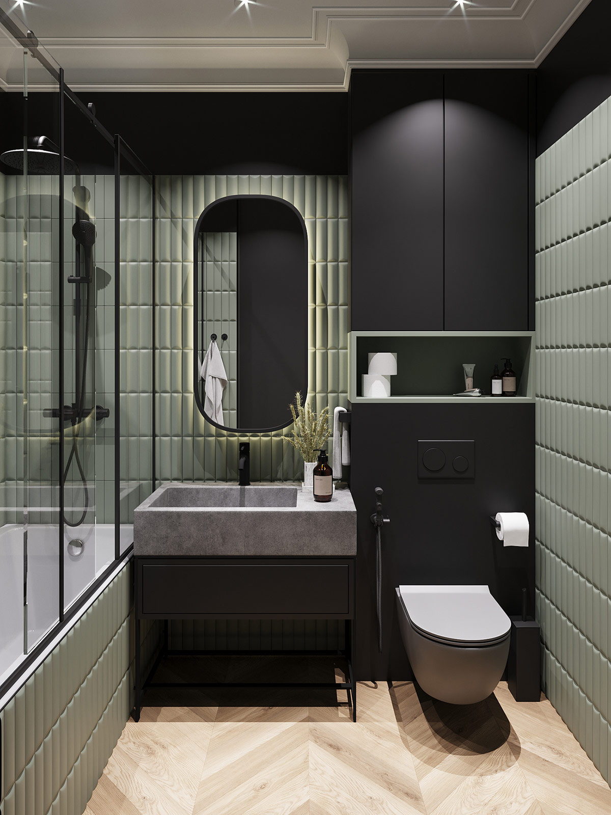 家庭浴室裝飾方案在黑色、灰色和綠色飽和色調下營造出戲劇性。