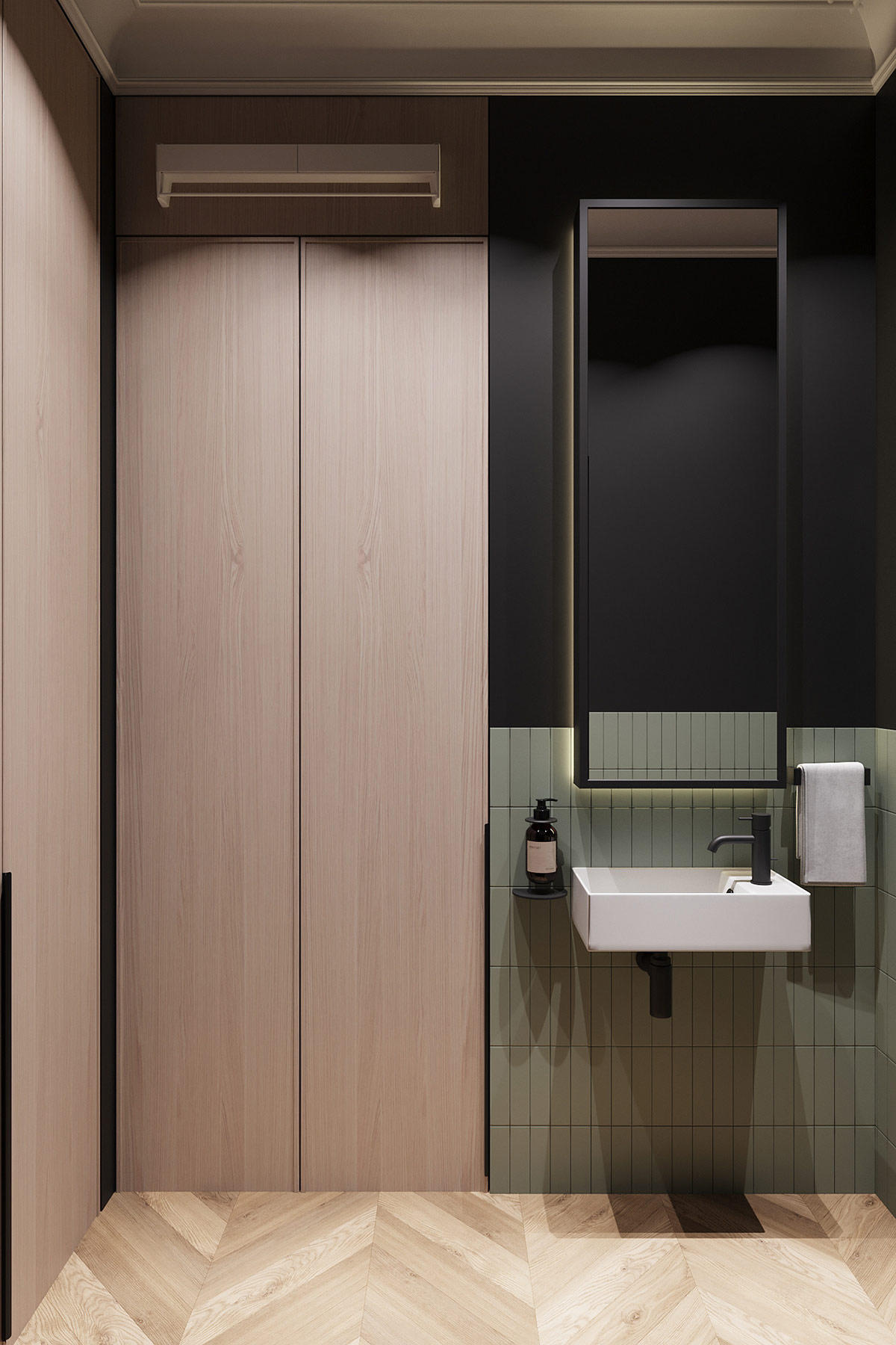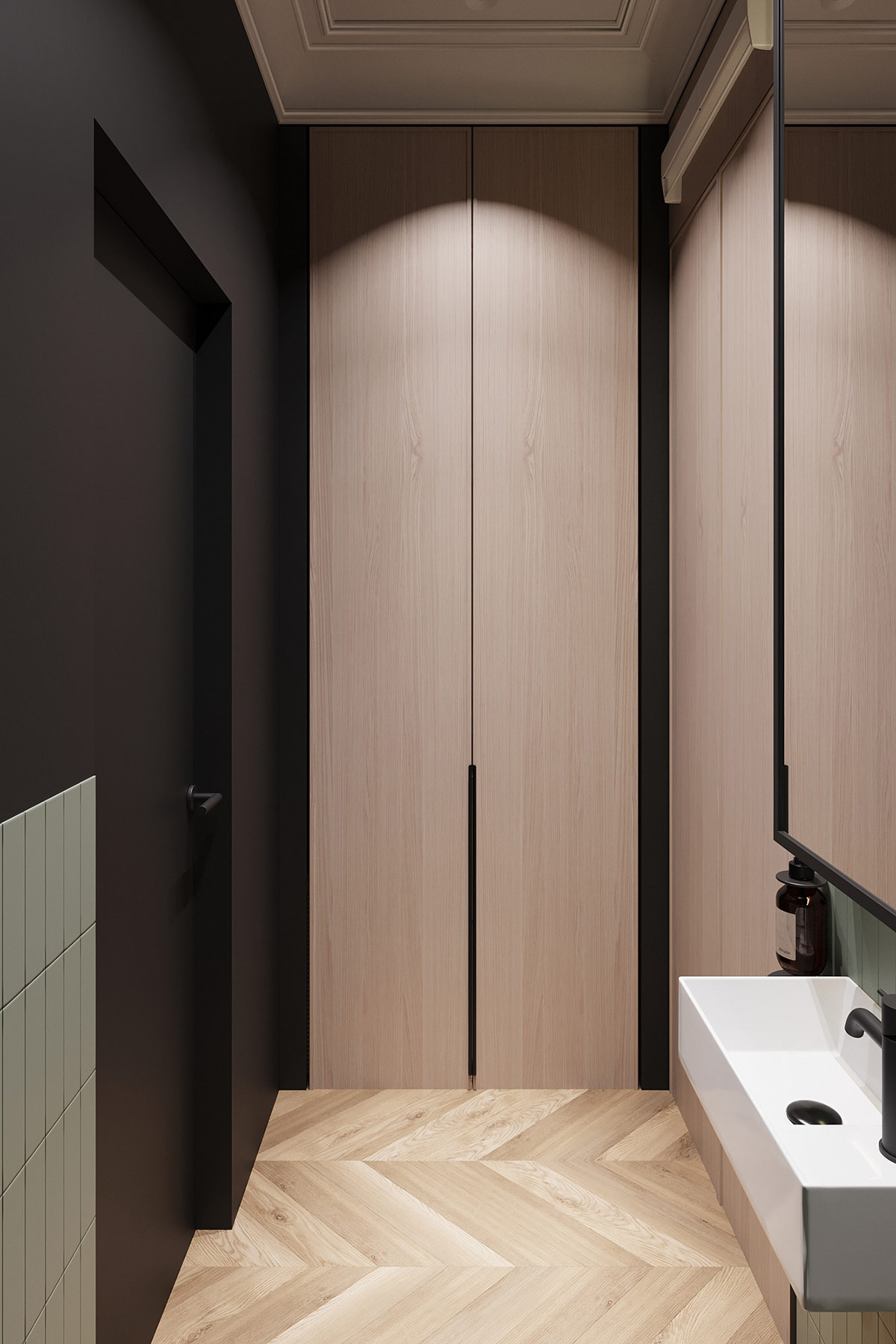 鼠尾草綠色入口油漆被淹沒并覆蓋在皇冠造型和天花板上,以創造清晰的分區。