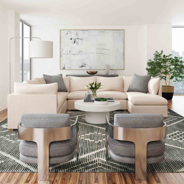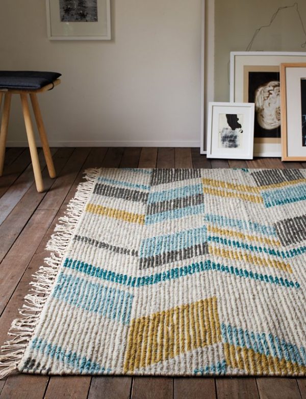 不對稱的大型現代區域地毯: Sandra Figuerola 的創新 Rustic Chic Geo 系列具有引人注目的不對稱輪廓,看起來像多個不同的地毯并排放置。這種設計由黃麻和羊毛制成,每個部分都使用不同的技術和不同的紋理編織而成。