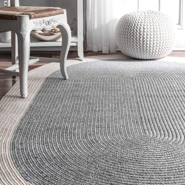 鑲邊灰色大橢圓形地毯:編織地毯是經典之選。這種設計提供了一種現代化的外觀,以灰色和象牙色的色調呈現,以便于協調。這件作品可以很好地補充室內主題,如當代鄉村、農舍別致、法國鄉村等。