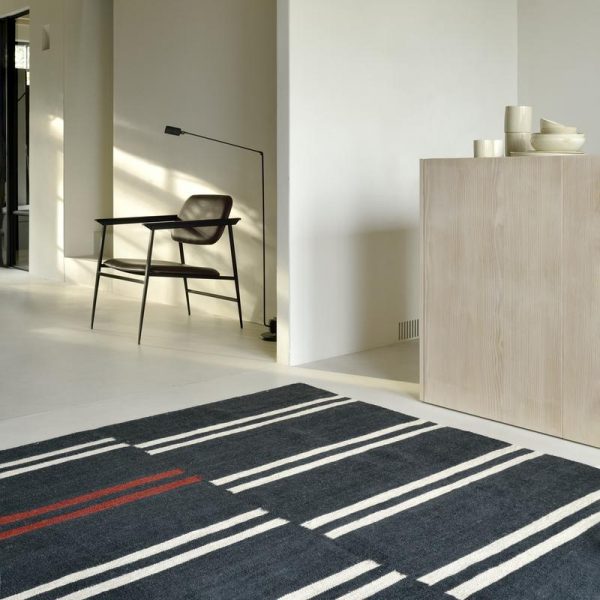 大號黑色和紅色區域地毯:這款大號地毯采用黑色平織,帶有偏移的白色條紋,一對鮮艷的紅色條紋作為醒目的焦點。使用這種 kilim 作為在較輕的內部進行對比的來源,或者使寬闊的開放空間感覺更加親密。