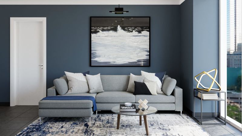這個現代客廳充滿了灰色調,中性色調的部分非常漂亮。左側組合沙發位于大窗戶的右側,可提供獨特的景觀。白色、藍色和黑色的重點枕頭,為組合增添了美麗的色彩。