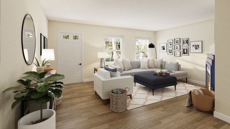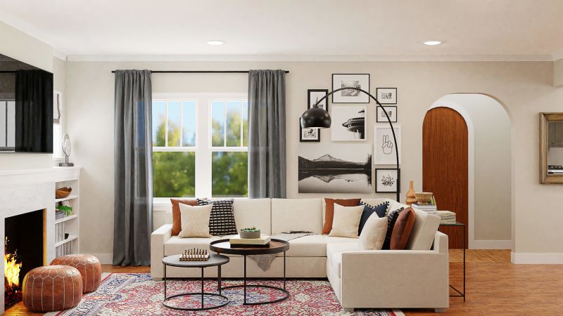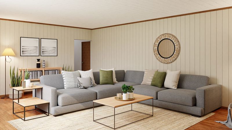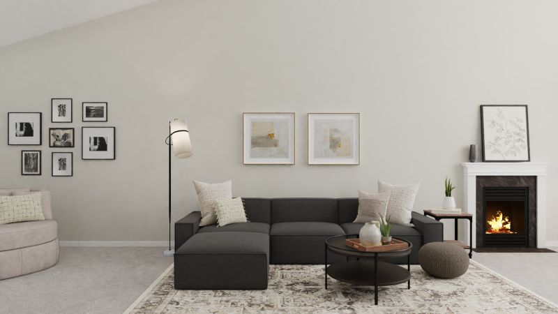 這個舒適的過渡客廳設計溫暖而溫馨,有多種座位可供選擇,尤其是深灰色角落部分。米色、白色和黃色的枕頭為沙發增添了色彩,使其更具吸引力。L形轉角截面也為房間帶來復古氣息。