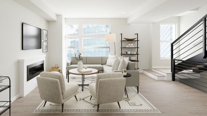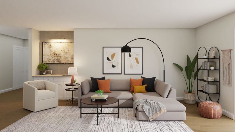 這間現代質樸的客廳采用中性色調,配有終端沙發,深座椅和豪華誘人的室內裝潢為整個房間帶來精致。為了增添色彩,搭配了黃色、黑色和橙色的重點枕頭。