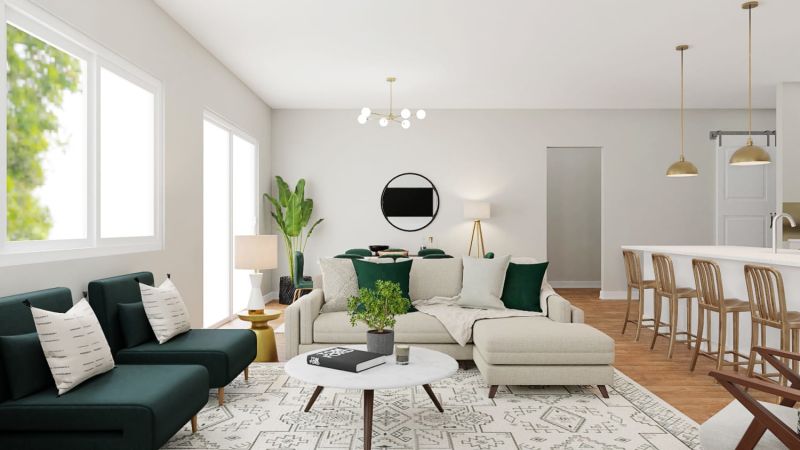 這種現代質樸的農舍客廳設計結合了現代元素和樸實的色調。這間客廳的亮點是2件式皮革超大截面。皮革部分帶來奢華感,并配有重點靠墊和森林綠色色調。