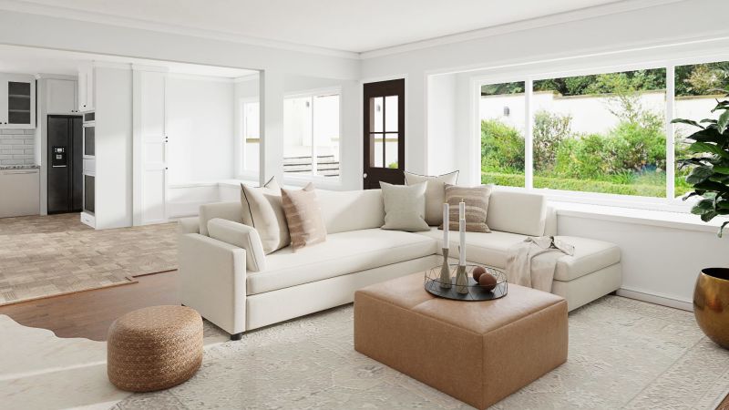 這間現代海濱客廳擁有通風和輕盈的感覺。3 件低角組合盡管尺寸過大,但與設計完美融合,并與房間的暖色調取得了完美的平衡。非常適合大型家庭和朋友聚會。